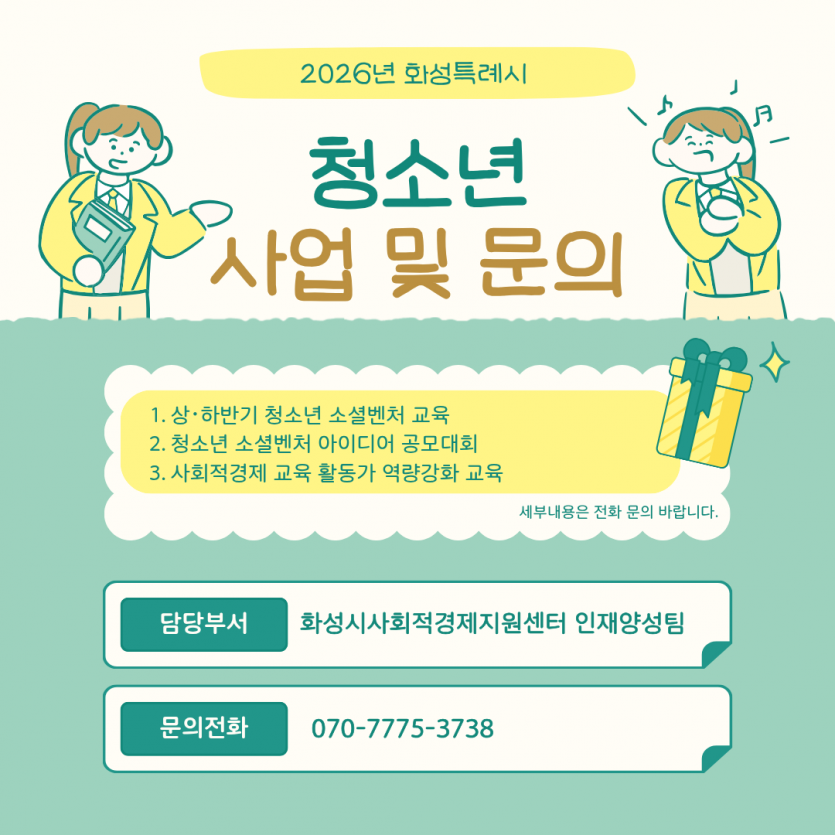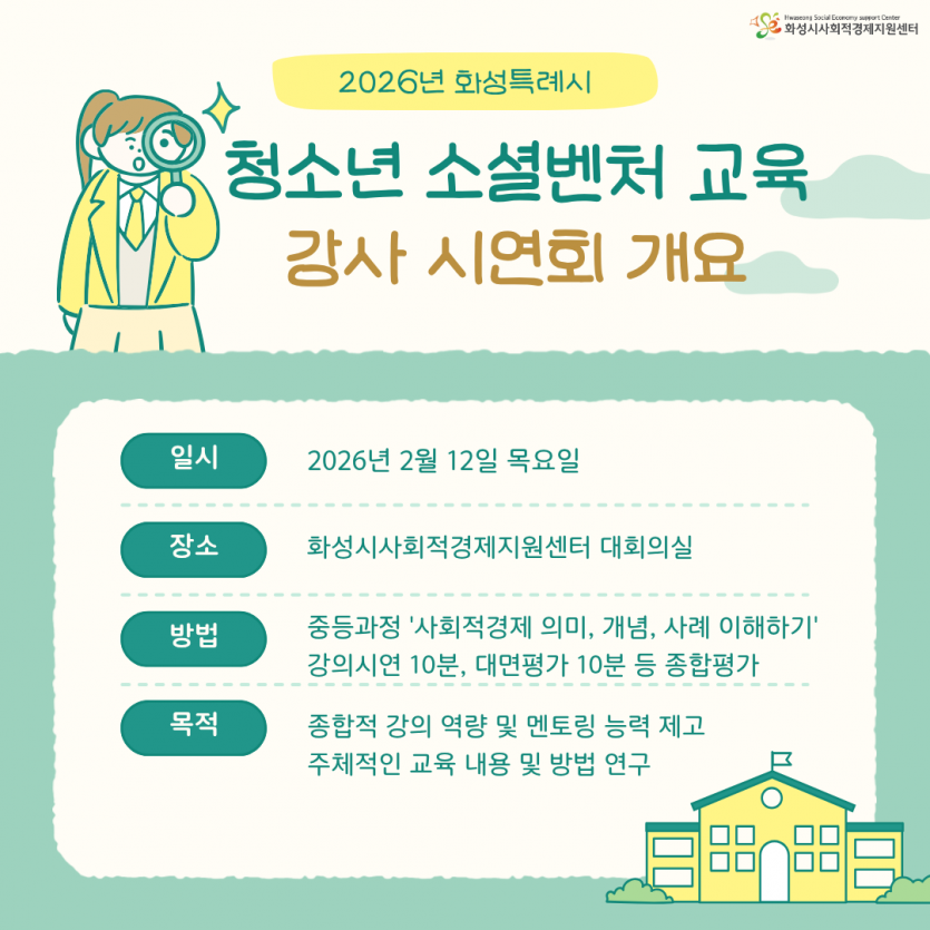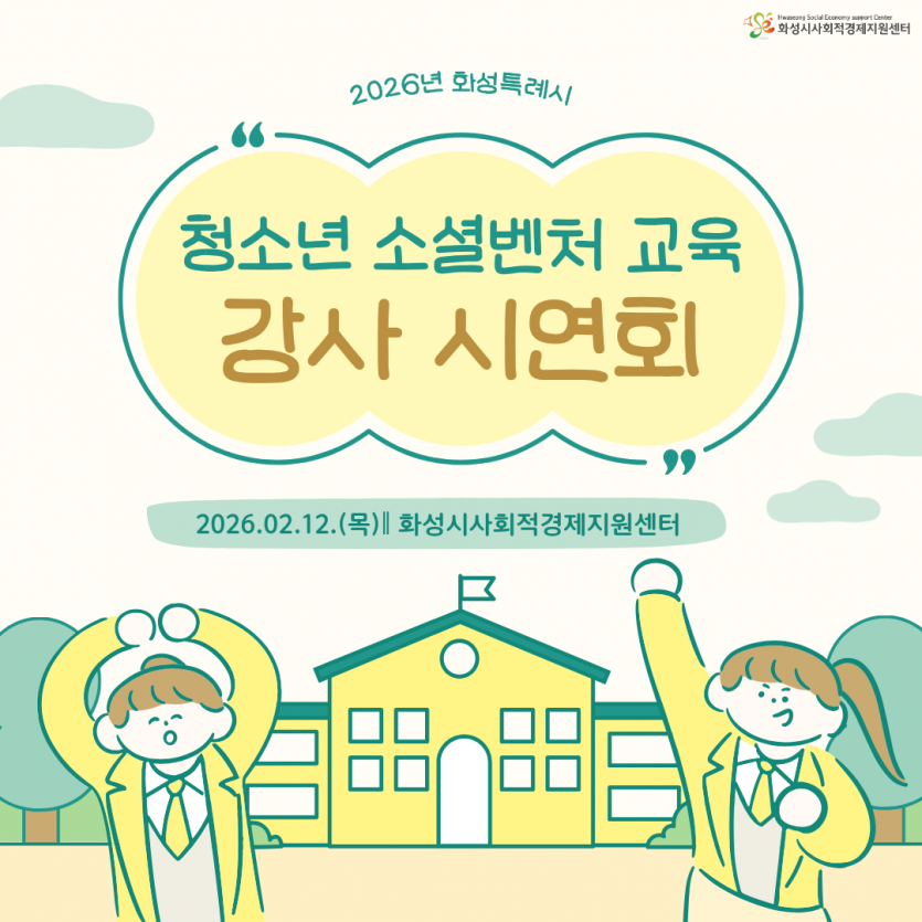 - 다음글2026년 화성특례시 사회적경제 교육 활동가 설명회(1/30) 26.02.02
