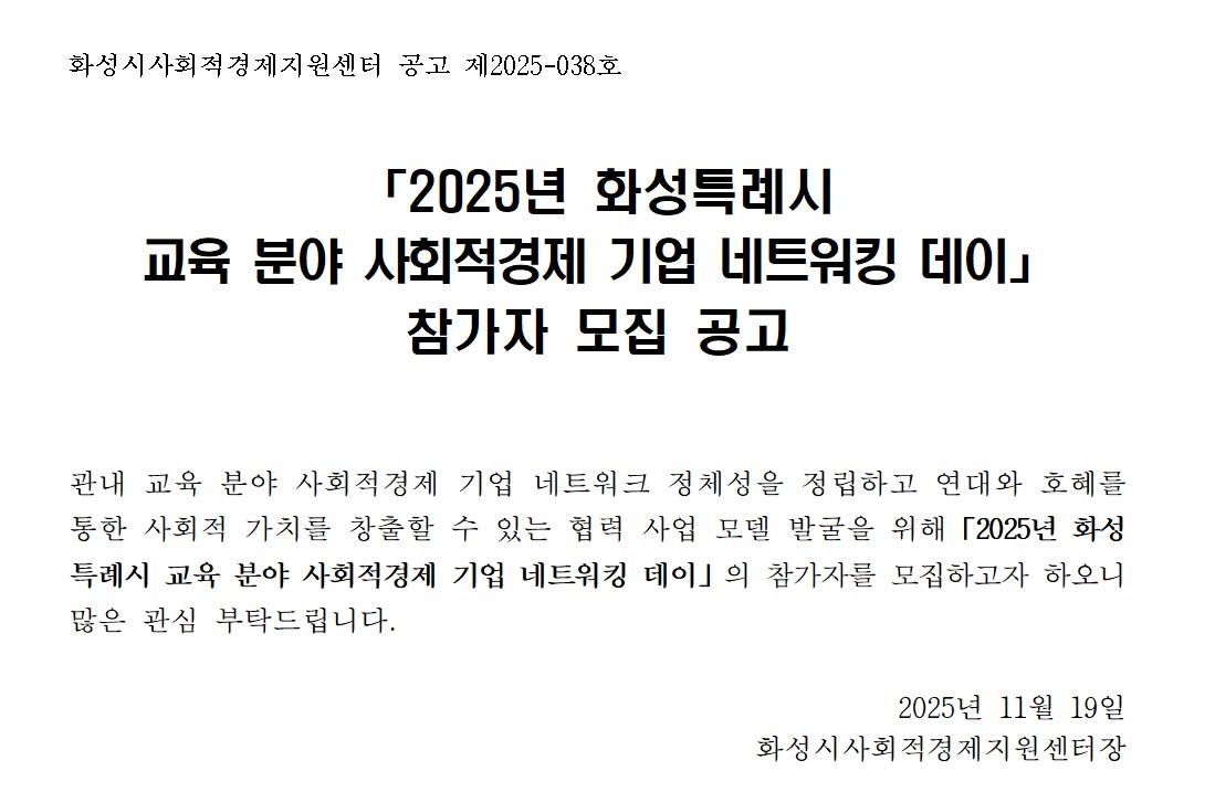 [공고번호 2025-038] 2025년 화성특례시 교육 분야 사회적경제 기업 네트워킹 데이 공고.pdf (155.5K)