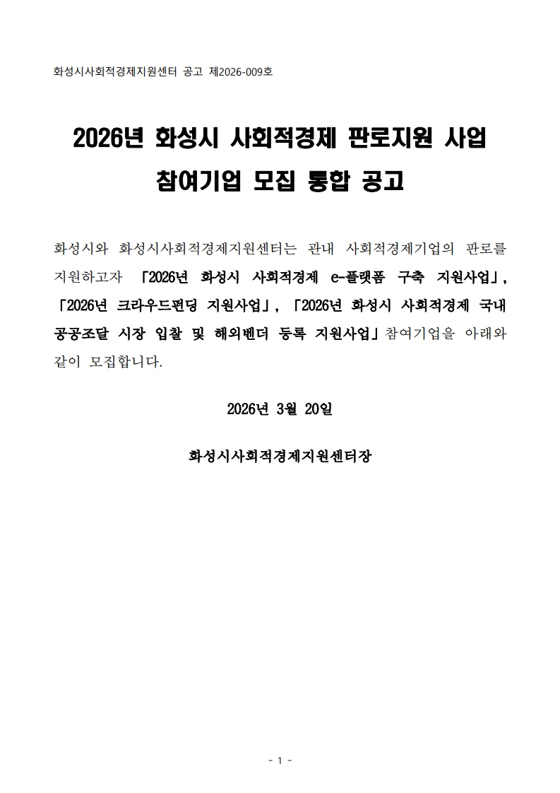 - 다음글2026년 화성시 사회적경제 e-플랫폼 구축 등 지원사업 선정기업 공고 26.03.20