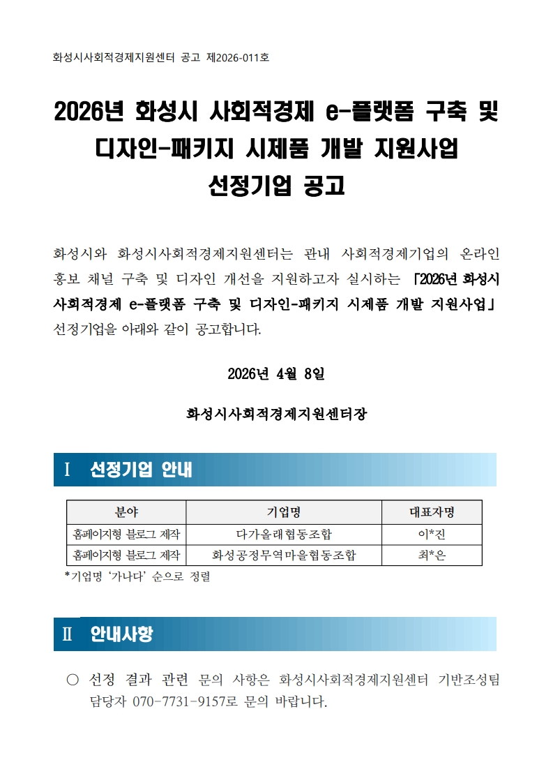 2026년 화성시 사회적경제 e-플랫폼 구축 등 지원사업 선정기업 공고(3차)