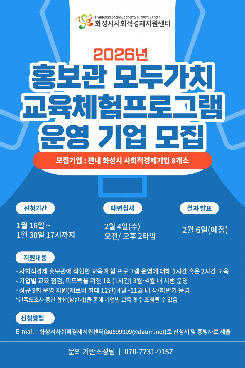 2026년 화성시 사회적경제 홍보관 '모두가치' 교육 체험 프로그램 운영 기업 모집 공고